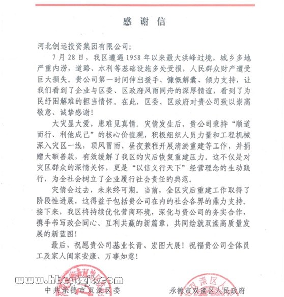 近日,承德市雙灤區(qū)區(qū)委、區(qū)政府向河北創(chuàng)遠(yuǎn)投資集團(tuán)發(fā)來感謝信,對(duì)創(chuàng)遠(yuǎn)集團(tuán)在今年抗洪搶險(xiǎn)期間第一時(shí)間伸出援手、與區(qū)委、區(qū)政府和當(dāng)?shù)厝罕婏L(fēng)雨同舟的深厚情誼,表達(dá)了誠摯的感謝。